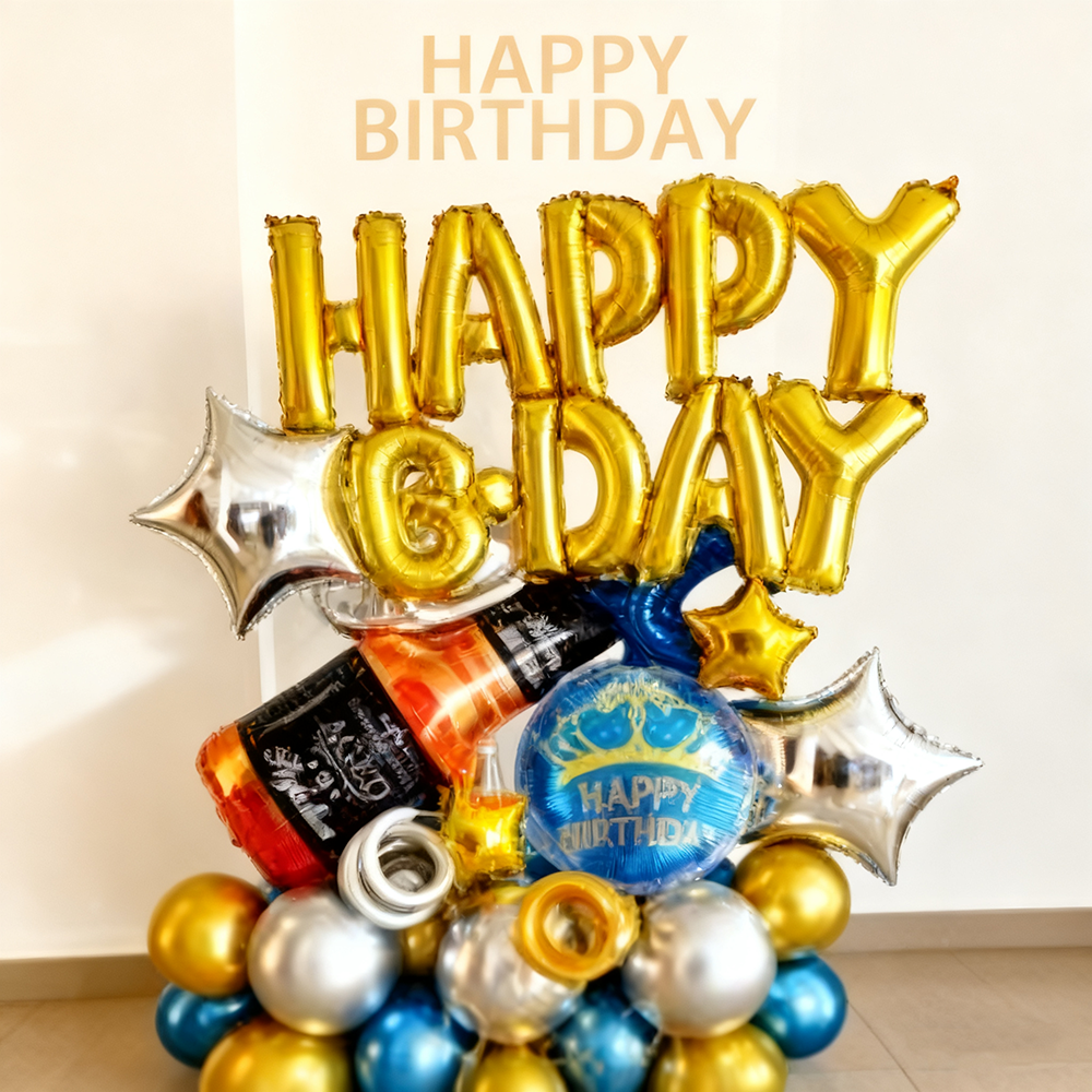 Gold Happy Birthday w/Bottle Balloon Bouquet/set